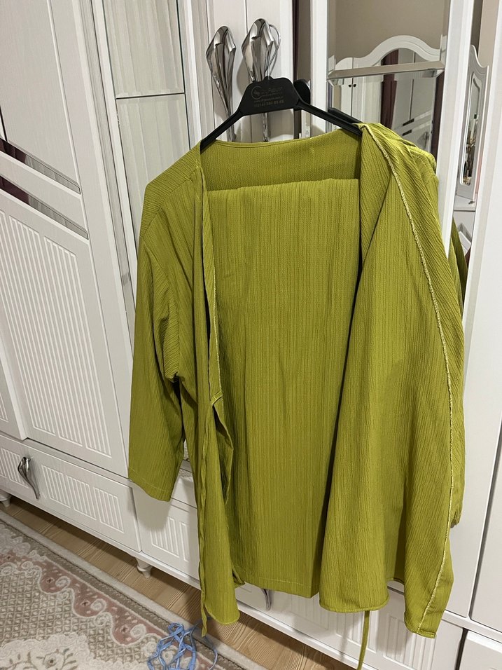 Yeşil renkte, sokak stiline uygun, yumuşak dokulu ve rahat kesimli Kimona