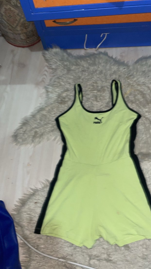 Yumuşak kumaştan, askılı ve yeşil renkte, spor ve günlük şıklık için uygun, vücuda oturan kısa tulum. ♀️