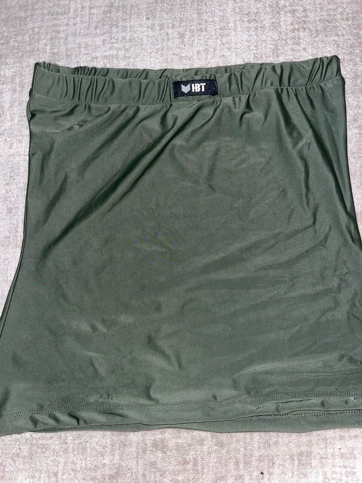 Yeşil renkli, elastik bel bantlı, düz ve rahat esnek kumaştan yapılmış mini etek, sokak modası ve dış mekan kullanımı için uygundur.