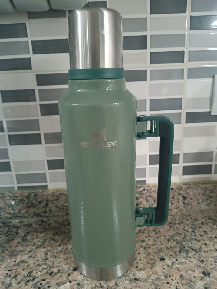 Yeşil renkli Stanley termos, dayanıklı sapı ve paslanmaz çelik kapağı ile içecekleri uzun süre sıcak veya soğuk tutar. Çocuklar için uygundur.