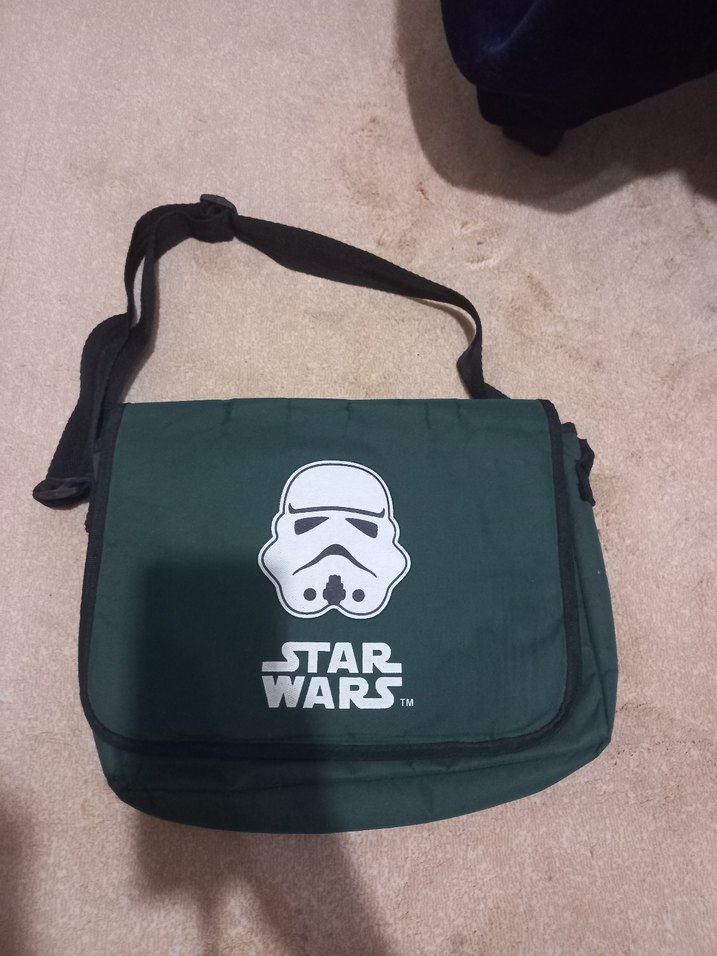 Ayarlanabilir askılı, ön kapakta Star Wars temalı beyaz Stormtrooper figürü bulunan koyu yeşil çanta