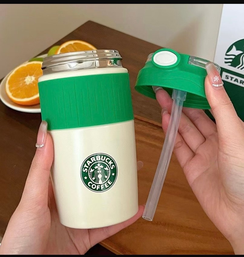 Starbucks marka, açık yeşil tutma kısmı ve çıkarılabilir pipetli kapağı olan termos matara. ☕