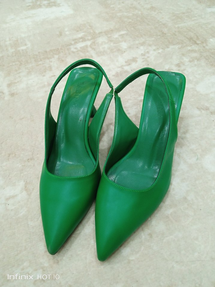 Parlak yeşil stiletto topuklu ayakkabı, minimalist ve çağdaş bir tarz sunar.