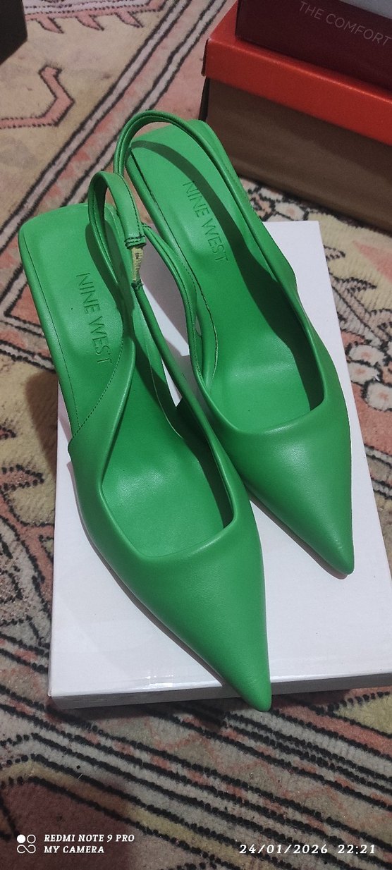 Yeşil parlak stiletto kemerli detaylı. Nine West markasına ait, sokak modasına uygun günlük kullanım için.