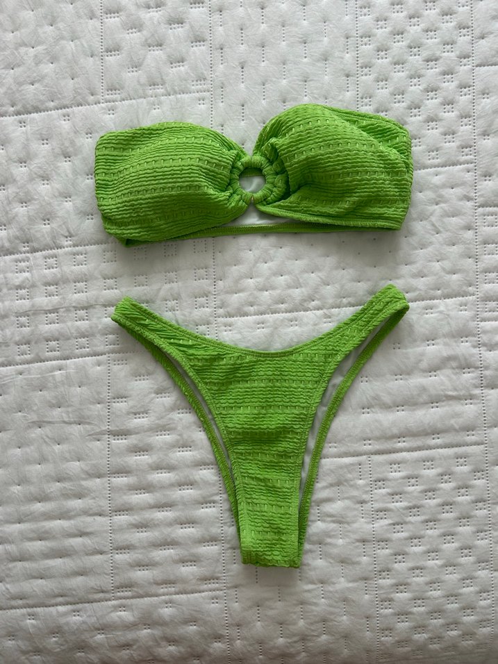 Orta uzunlukta, yeşil straplez bikini takımı, bohem tarzda ve ince dokulu kumaştan, sade ve şık bir görünüm sunar.