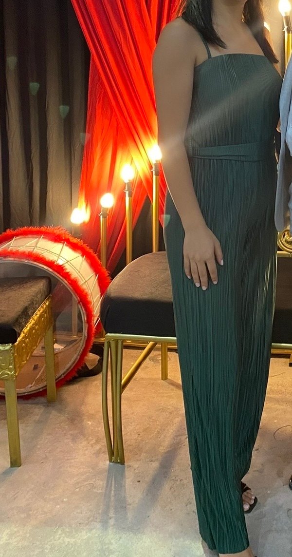 Straplez, pilili, yeşil uzun tulum. İnce askılı ve bohem Paris tarzında, düğünler için uygun. Zümrüt yeşilidir.