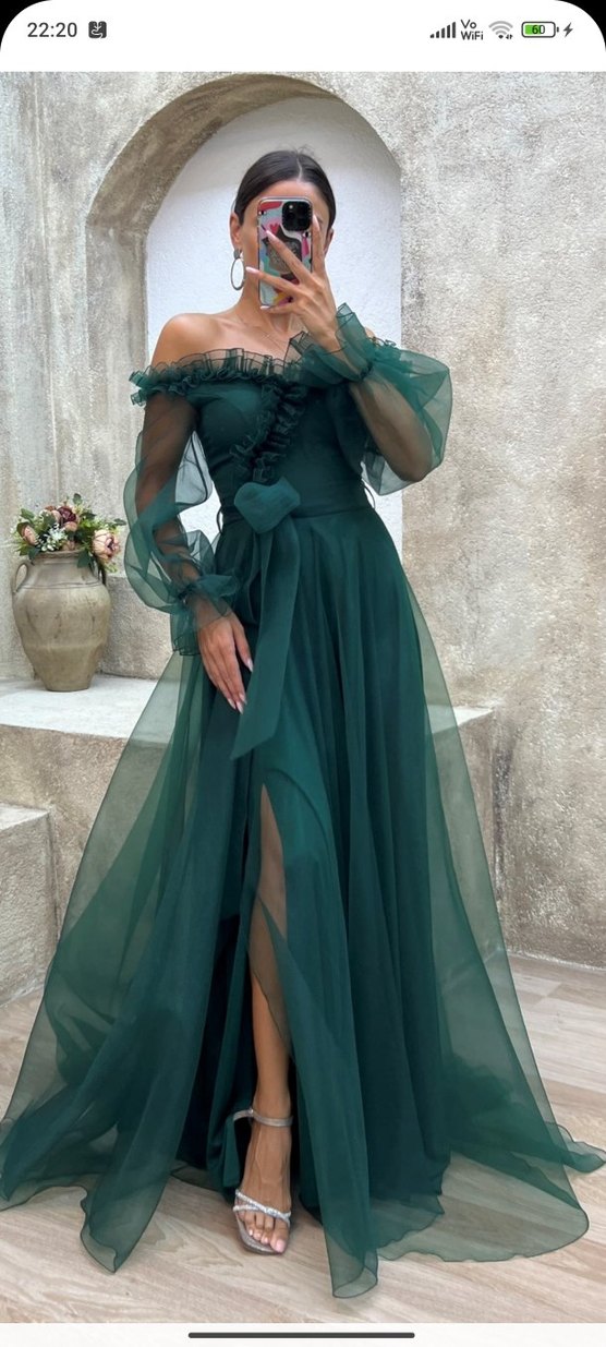 Bu koyu yeşil uzun abiye elbise, straplez yaka ve drapeli tasarıma sahiptir. Straplez kollu, vücuda oturan kesimi ve yırtmaç detayıyla bohem ve klasik şıklığı bir araya getirir.