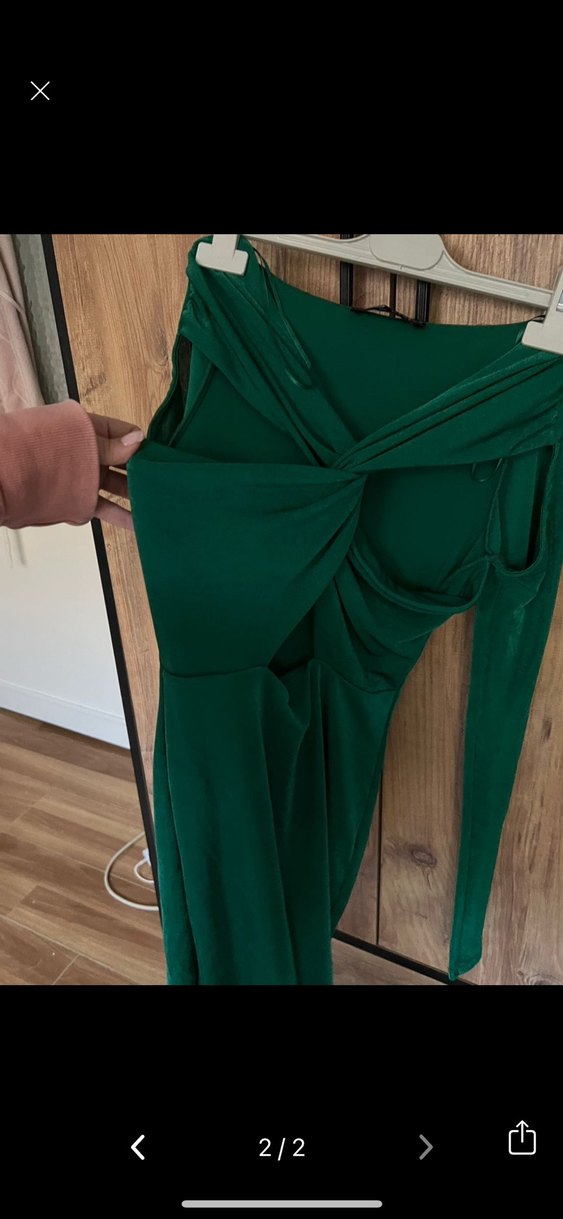 Yeşil, straplez yakalı, ince askılı, yırtmaçlı, uzun ve vücuda oturan abiye elbise, parlak ve avant-garde sokak stiliyle parti için uygundur.