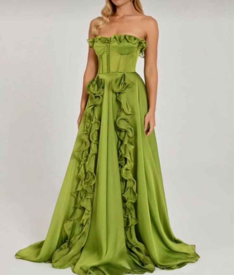 Yeşil renkli, straplez ve uzun boyda fırfırlı abiye elbise. Parlak dokusu, bohem tarzı ve regular kesimi ile düğünlerde şık bir tercih sunar. geceelbise #abiye #yırtmaçlıabiye #saten #satenabiye #abiye #mezuniyetelbise #nişanelbise #düğün #nişan #straplezabiye #abiye #drapeli #drapeliabiye #korsedetaylıabiye