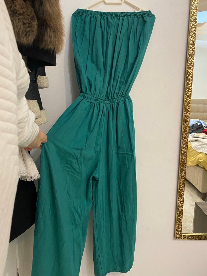 Yeşil renkli, straplez ve bol kesim kadın tulum, keten kumaştan, drapeli tasarıma sahip, bohem tarzda günlük kullanım için uygun.