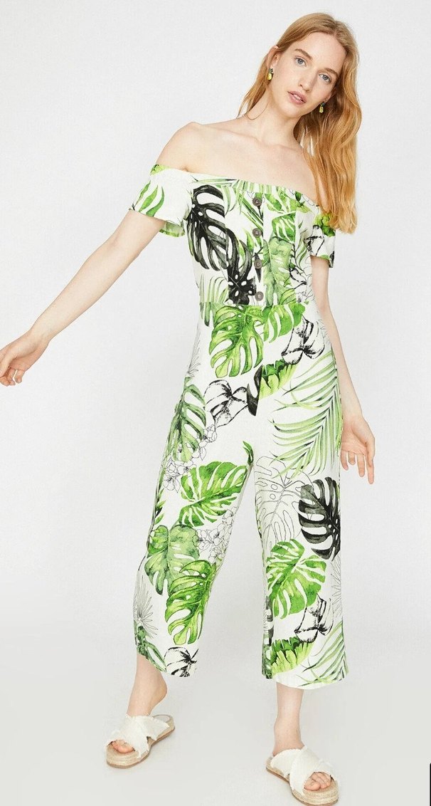Yeşil renkli, straplez ve kısa kollu uzun tulum. Rahat kesimi, pileli detayları ve canlı yaprak desenleri ile günlük kullanıma uygun.