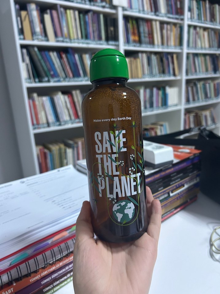 Koyu yeşil su şişesi , "Gezegeni Koru" yazılı çevre temalı baskıya sahiptir. Güvenli kapaklı, kullanışlı tasarıma sahiptir.