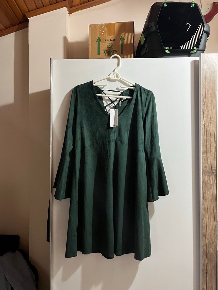 Yumuşak süet kumaştan, bol kesim, uzun boy yeşil elbise,arkası ip detaylı