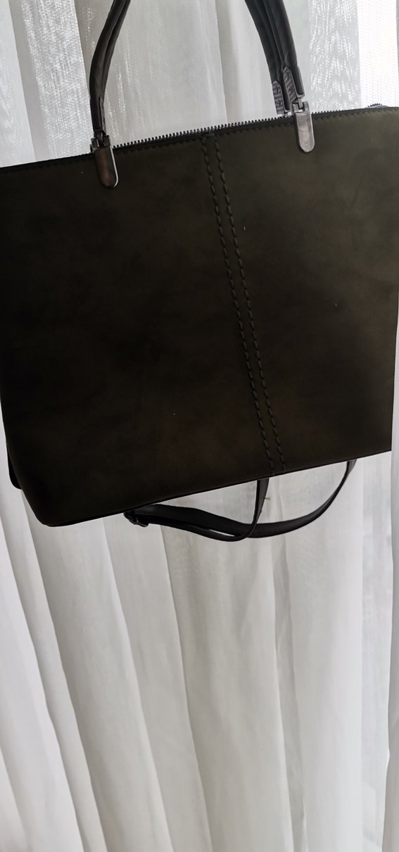 Haki renk Süet deri kadın çanta, tokalı detay ve minimalist, çağdaş tasarıma sahiptir. Desensiz yüzeyi ve şık stili, modayı takip edenler için günlük kullanıma uygundur.