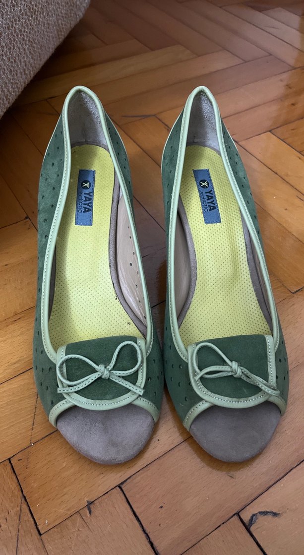 Yeşil süet malzemeden dolgu topuklu kadın ayakkabısı, tokalı detaylı ve pastel tonlarda. Rahat ve şık, romantik akşamlar için uygun.