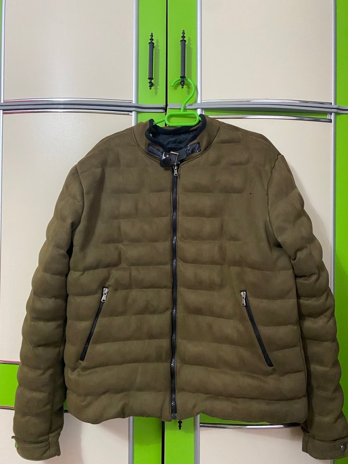Koyu yeşil süet kumaştan, fermuarlı, bisiklet yaka ve dar kesim erkek ceket. Sokak stiline uygun, uzun kollu ve normal midi boyda. Bilindik marka değilidr.