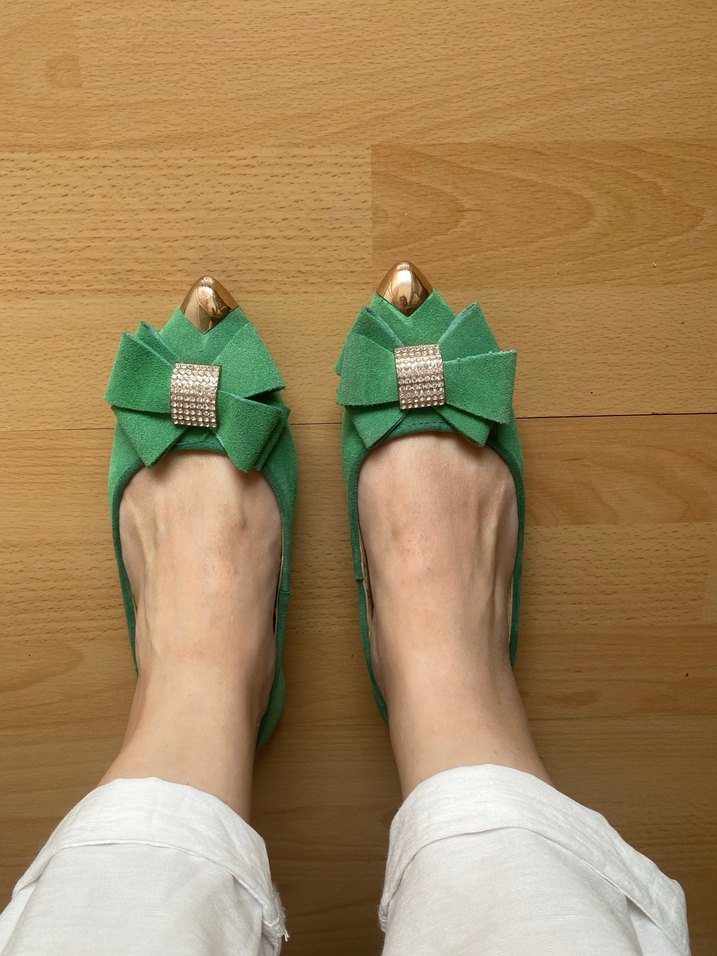Yeşil süet babet, parlak fiyonk ve metalik uç detaylarıyla bohem ve Paris tarzını birleştirir.