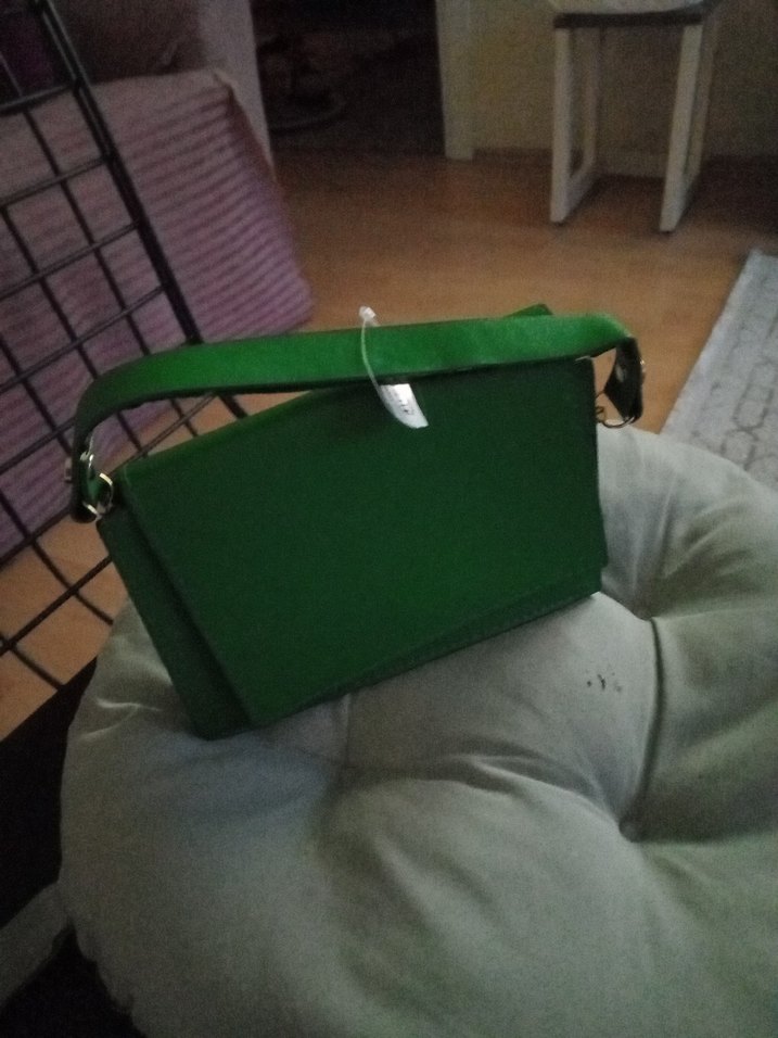 Yeşil süet malzemeden yapılmış, tokalı kayışa ve parlak görünüme sahip minimalist ve çağdaş tarzda kadın çantası. ✨