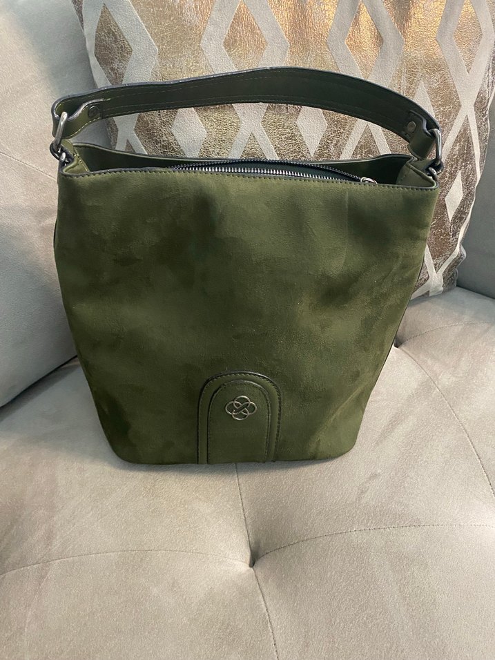Yeşil süet kadın çanta, tokalı askısıyla minimalist ve çağdaş tasarıma sahip, günlük kullanıma uygun. Düz yüzeyli ve gri tonlu detaylar içerir.