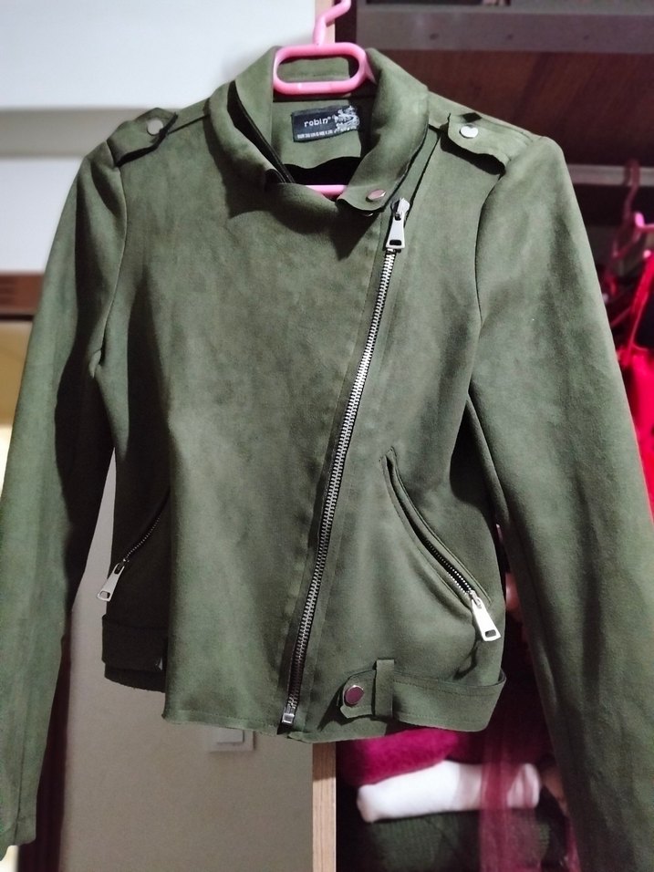 Yumuşak süet kumaştan yapılmış, fermuarlı cepleri ve kesimli yakası olan yeşil, dar kesim kadın deri ceket. Günlük sokak stili için uygundur.