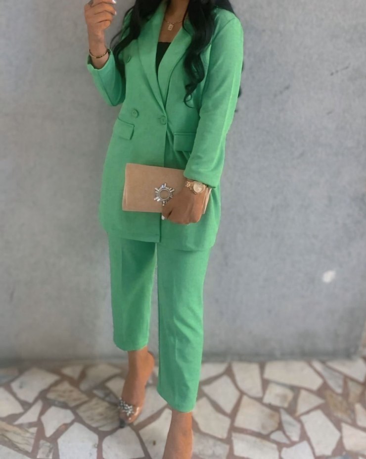 Yeşil süet kumaştan, kemerli uzun blazer ve uyumlu pantolondan oluşan, regular fit ve kesimle ofis için uygun kadın takımı. Strappy kollu, modern ve şık görünümlü.