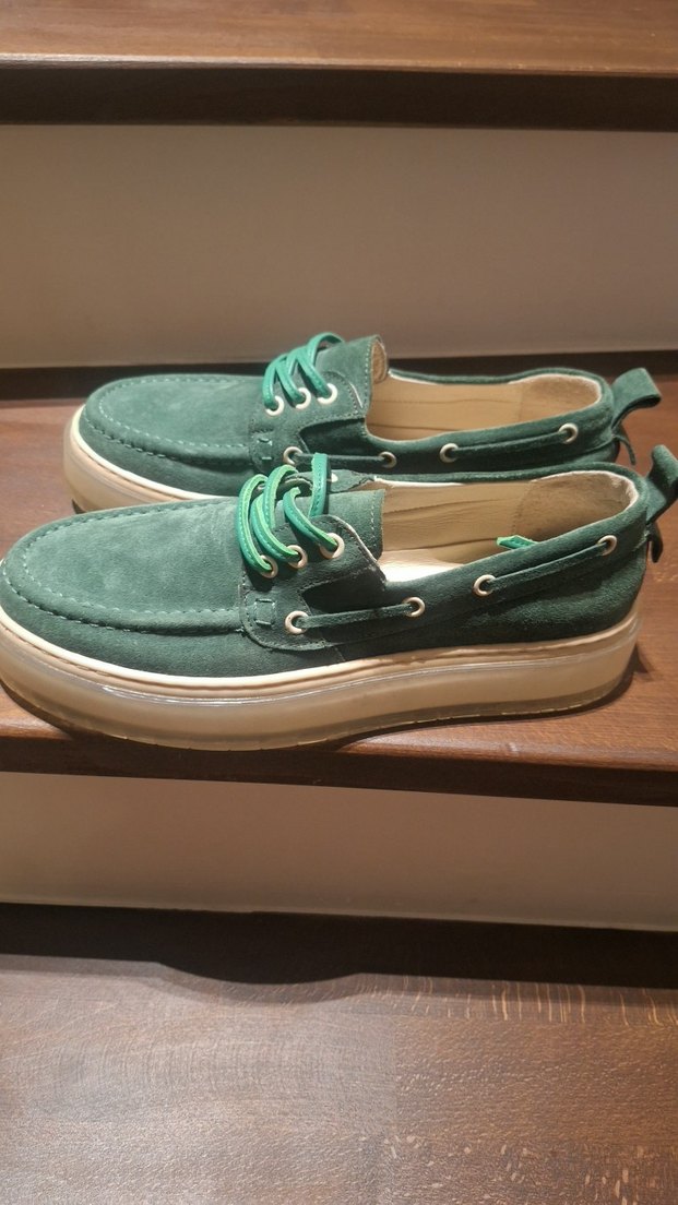 Yeşil süet malzemeden, platform topuklu kadın günlük ayakkabısı. Sokak stiline uygun, zahmetsiz şıklık sunar.