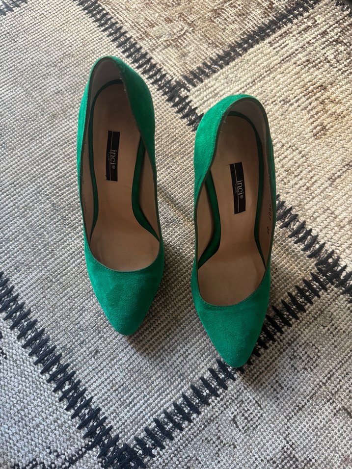 Yeşil süet malzemeden platform topuklu, tokalı kadın stiletto. Minimalist ve şık, ofis için uygun.