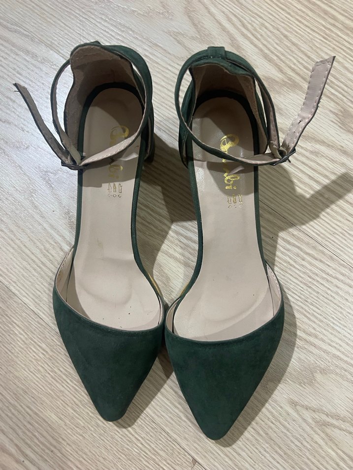 Yeşil süet stiletto topuklu, tokalı bilek kayışı ve hafif yılan deseniyle minimalist ve modern klasik tarzda.sadece bir kere kullandım