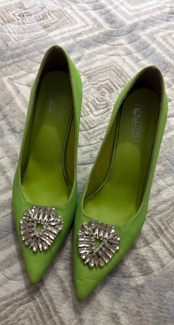 Yeşil süet malzemeden yapılmış, taşlı süslemeli dolgu topuklu abiye ayakkabılar, düğünler için çağdaş vintage tarz sunar.