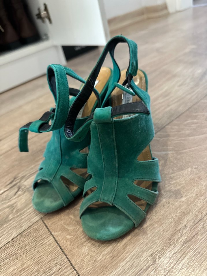 Yeşil süet malzemeden, tokalı kayışlı ve desenli stiletto topuklu kadın ayakkabı. Günlük kullanıma uygun, koyu renkli bohem tarzda şık bir model. Çok az kullanıldı. Hiç bir deformesi yoktur.