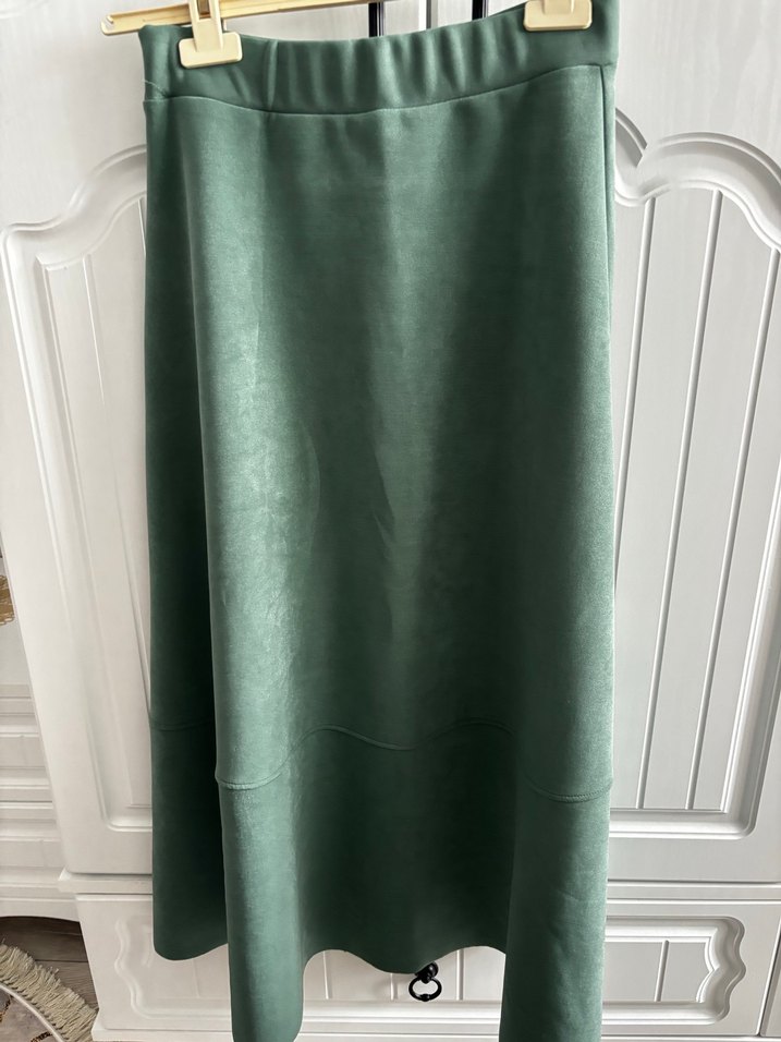 Uzun yeşil süet kumaştan yapılmış, drapeli tasarıma sahip, rahat kesim kadın eteği. Ofis için klasik ve konforlu bir seçenek.