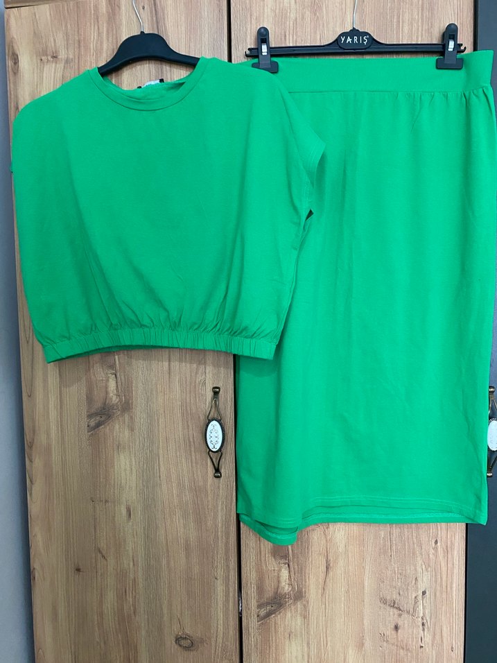 Yeşil renkte, yuvarlak yaka ve kısa kollu, bol kesim kadın tişörtü. Kısa boyu ve sade tasarımıyla günlük kullanıma uygun, renkli bir parça.