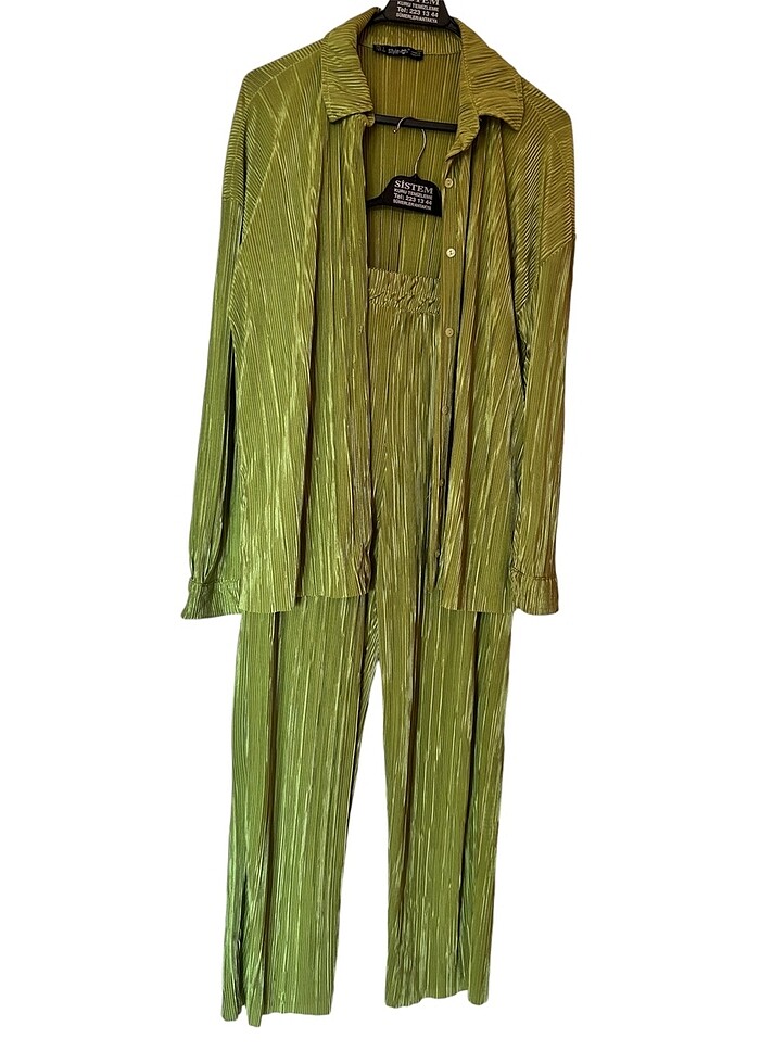 Hiç giyilmedi gömlek-pantolon takım halinde satılır. Herhangi bir deformasyon yok. Salaş çok rahat bir kumaşı vardır. Gömleğin boyu uzundur. Pantolon cepli ve paça detaylıdır. Tesettüre uygundur