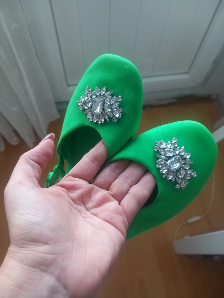 Yeşil renkli, taş işlemeli ve ince topuklu kadın ayakkabısıdır. Kauçuk malzemeden üretilmiş olup düğün ve çağdaş tarzlar için uygundur.