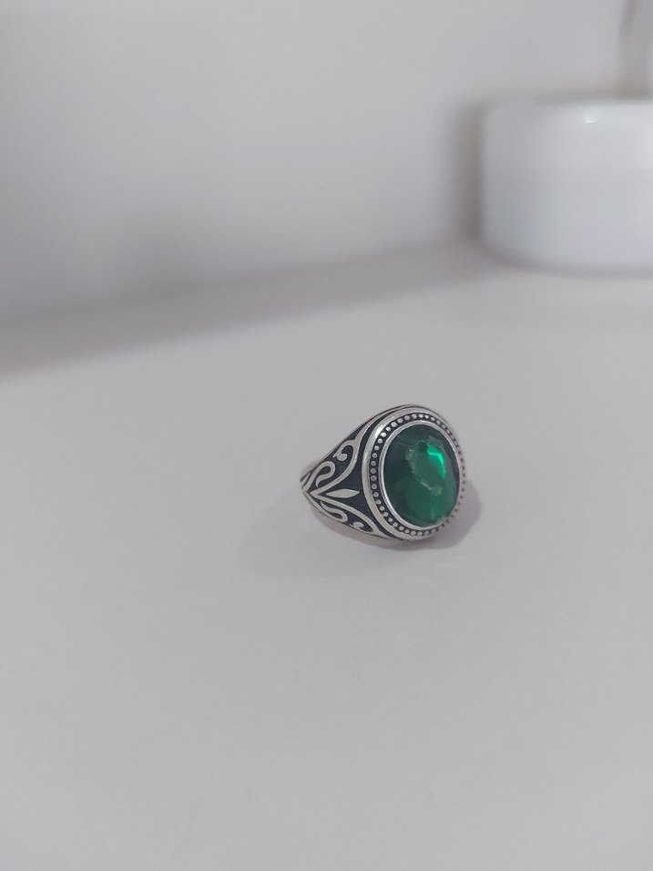 Parlak yeşil taş(plastik)ve bohem desenlere sahip vintage tarzda erkek yüzüğü.