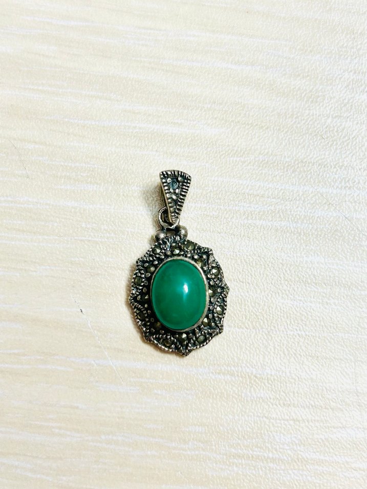 Bu bohem tarz kolye ucu, yeşil taş ve detaylı boncuk işlemeleriyle vintage bir görünüme sahip, gümüş kolye ucudur.
