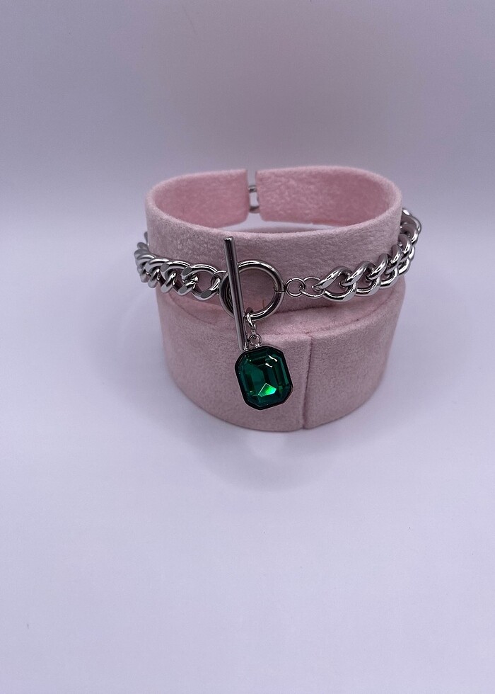 Yeşil taşlı gümüş gri renk zincirli çelik bileklik