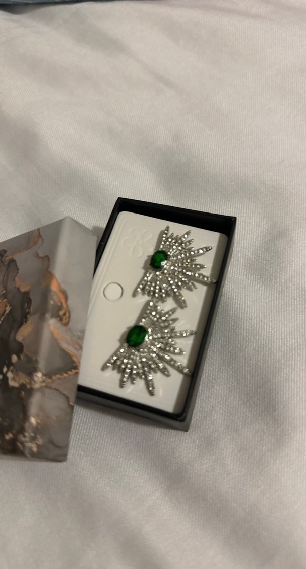 Koyu yeşil taşlar ve parıltılı payetlerle süslenmiş kısa uzunlukta bohem tarzı küpe, düğünler ve klasik zarafet için uygun.