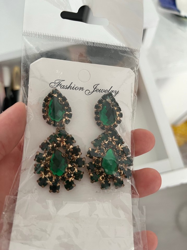 Payetlerle süslenmiş yeşil taşlı küpeler, bohem tarzda, düğün ve şık etkinlikler için uygun. Baskılı desenli ve midi boyda. Kına mda sadece takmıştım