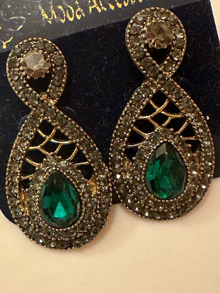 Uzun, yeşil taşlı ve pullu desenli küpeler, bohem tarzı klasik zarafetle buluşturur, romantik akşamlar için uygun.