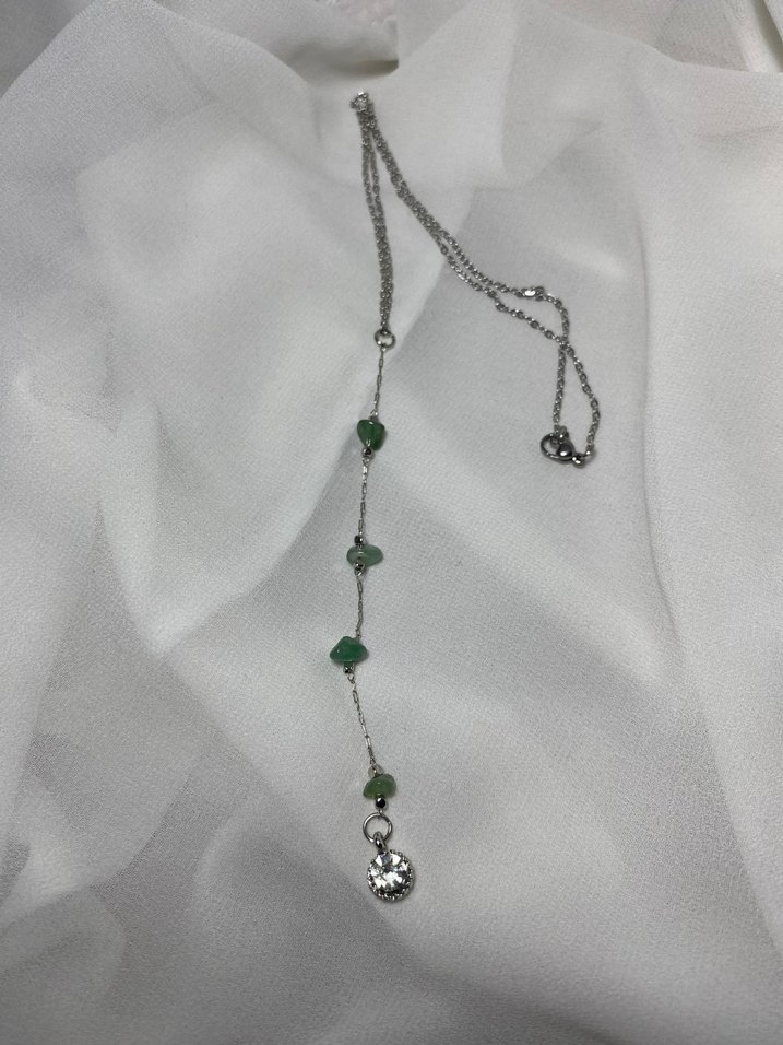 Uzun gümüş zincir üzerinde küçük yeşil taşlar ve yuvarlak bir kolye ucu bulunan, minimalist ve bohem tarzı bir kolye.