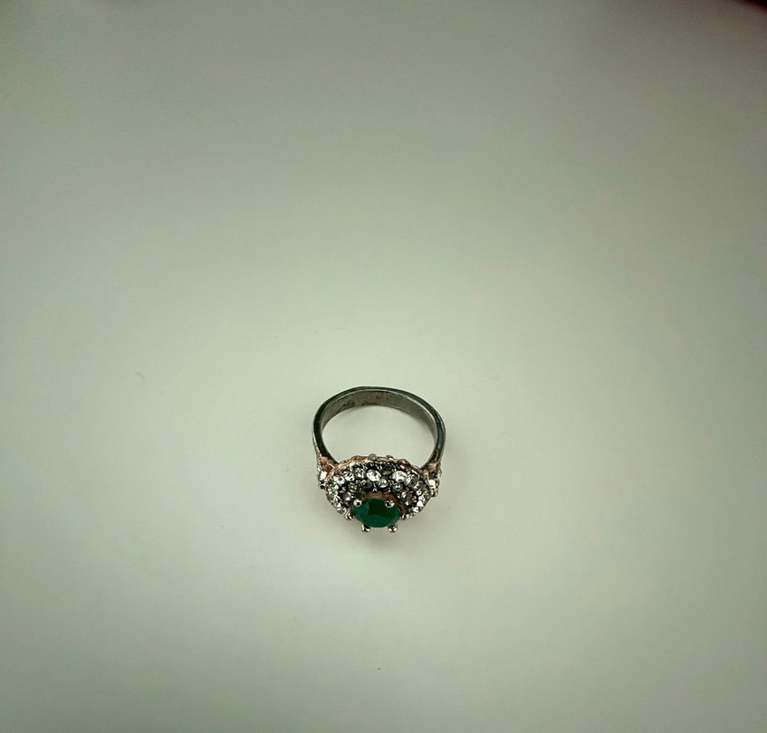 Yeşil taş ve payet detaylı vintage kadın yüzük, bohem ve retro düğün stilleri için uygun.
