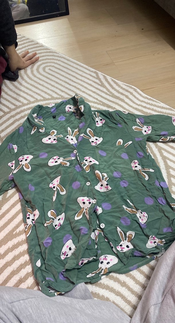 Bol kesim, uzun kollu, düğmeli ve yakalı gömlek. Yumuşak sentetik kumaştan, pastel yeşil tie-dye ve tavşan desenli. Günlük kullanıma uygun.
