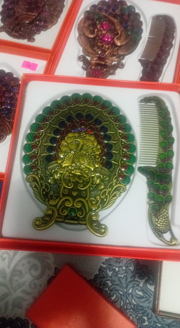 Renkli detaylarla süslenmiş yeşil tavuskuşu desenli tarak ve aynadan oluşan set. Tarak sapı da aynı desene sahiptir.