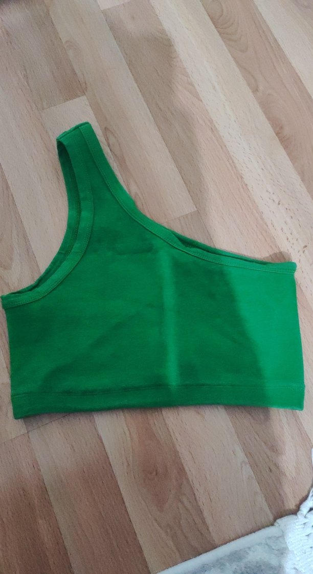 yeşil, sentetik kumaştan yapılmış tek omuzlu, vücuda oturan crop top. Spor ve sokak modasına uygun.