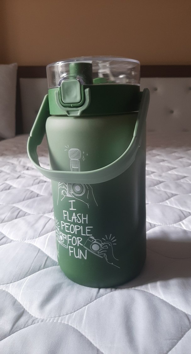 Kilitli kapaklı ve taşıma saplı koyu yeşil çocuk ve yetişkinler icin termos şişesi. Üzerinde 'I FLASH PEOPLE FOR FUN' yazılı eğlenceli kamera teması bulunur. cok az kullanildi, defirmesi yoktur. 1400 ml, 24 cm, su tasimak ve icmek icin ideal