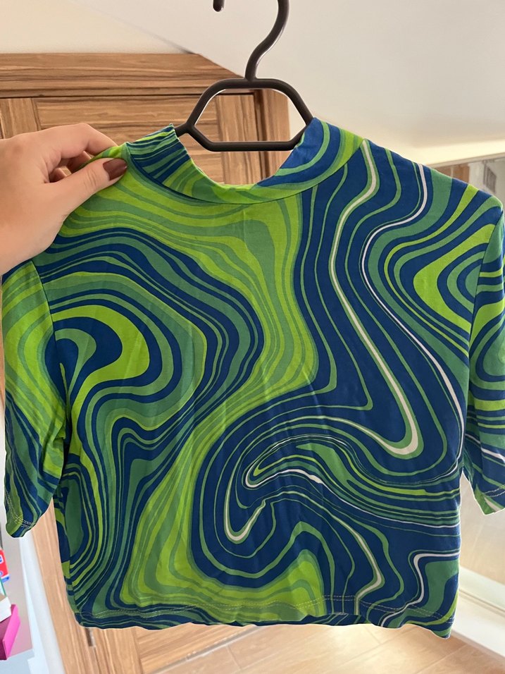 Yeşil tie-dye desenli, kısa kollu, boğazlı, drapeli ve vücuda oturan kadın bluzudur. Rahat sentetik kumaştan, günlük sokak giyimi için uygundur.