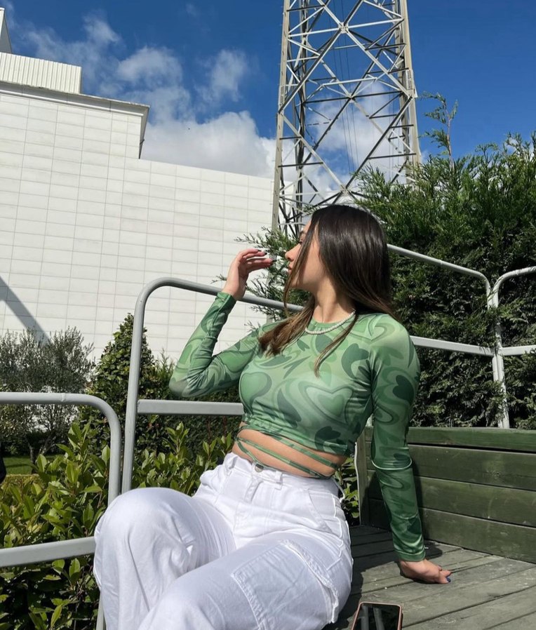 Yeşil renkte, uzun kollu ve yüksek yakalı, transparan tie-dye desenli fitted crop top. Outdoor sokak stili için uygundur.