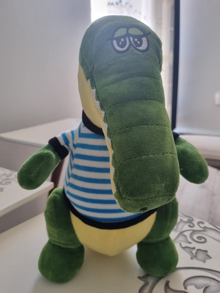 Çizgili tişörtlü yeşil timsah peluş oyuncak, neredeyse kullanılmadı ayakta duruyor, o haliyle 37 cm civarı.