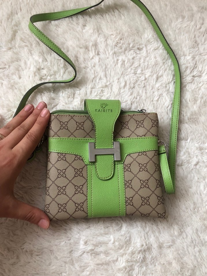 Pastel yeşil deri tokalı kayış ve baskılı modern klasik tasarıma sahip kadın çantası, trend günlük stil için uygundur.